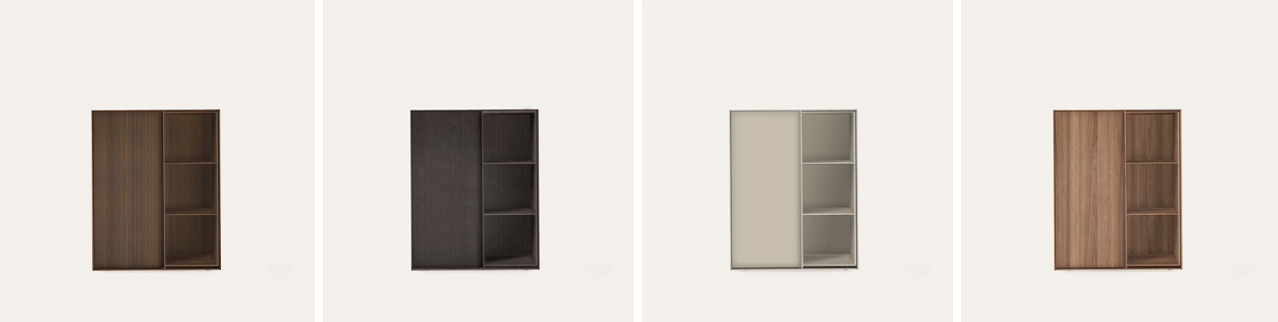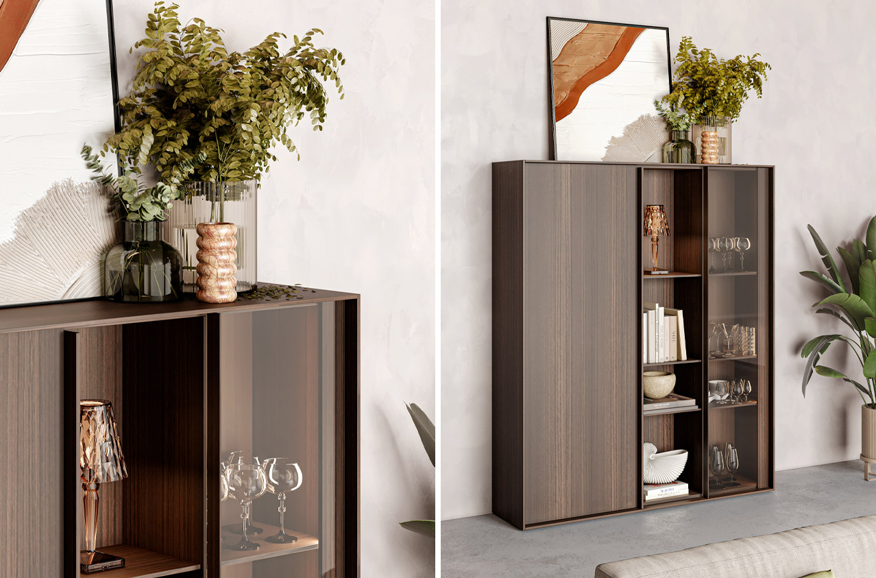 Ao integrar vidro na sua estrutura, introduz profundidade e leveza. A luz atravessa a peça, cria reflexos subtis ao longo do dia e desenha novas camadas dentro do espaço. E quando falamos de vidro, falamos de intenção. Transparente, para uma leitura mais direta, ou fumado, para filtrar o olhar e tornar o interior mais reservado. A escolha do acabamento da estrutura — madeira natural, lacado ou metal — vai definir se a vitrine terá uma presença mais sólida ou mais leve.