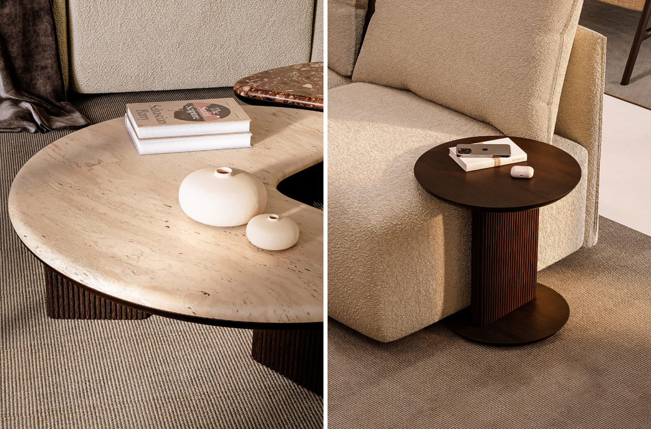 Um dos maiores desafios ao mobilar uma casa está na combinação de peças diferentes. Misturar materiais, tons e formas pode resultar, mas exige tempo, experiência e alguma margem para erro. A Aura responde a isso de forma direta. Todas as peças partem do mesmo desenho, onde linhas direitas criam estrutura e curvas subtis suavizam a leitura. O resultado é uma coleção coesa, onde cada elemento funciona bem por si, mas ainda melhor em conjunto.