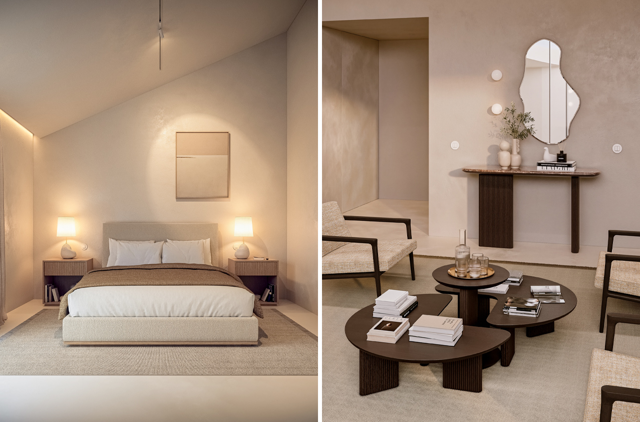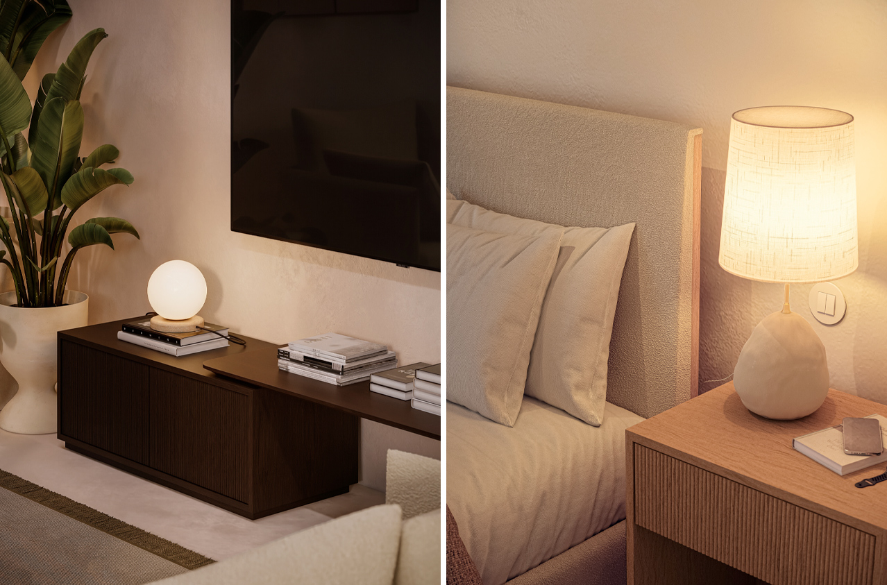 Esta consistência permite construir espaços mais equilibrados sem esforço excessivo. A mesa de centro relaciona-se naturalmente com o móvel TV. A consola prolonga a mesma lógica na entrada ou zona de passagem. No quarto, a cama e as mesas de cabeceira seguem o mesmo raciocínio, criando uma continuidade visual que traz calma ao espaço.