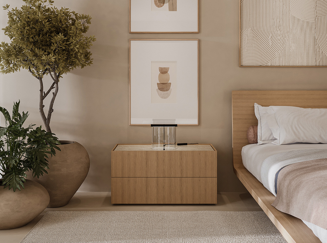 À volta da cama, cada escolha foi feita com intenção. A nossa linha Antony — presente nas mesas de cabeceira e na cómoda — traz um equilíbrio entre o calor do carvalho natural e a textura crua do travertino. As linhas retas e os volumes bem proporcionados oferecem funcionalidade sem abrir mão da elegância, encaixando-se no espaço com naturalidade.