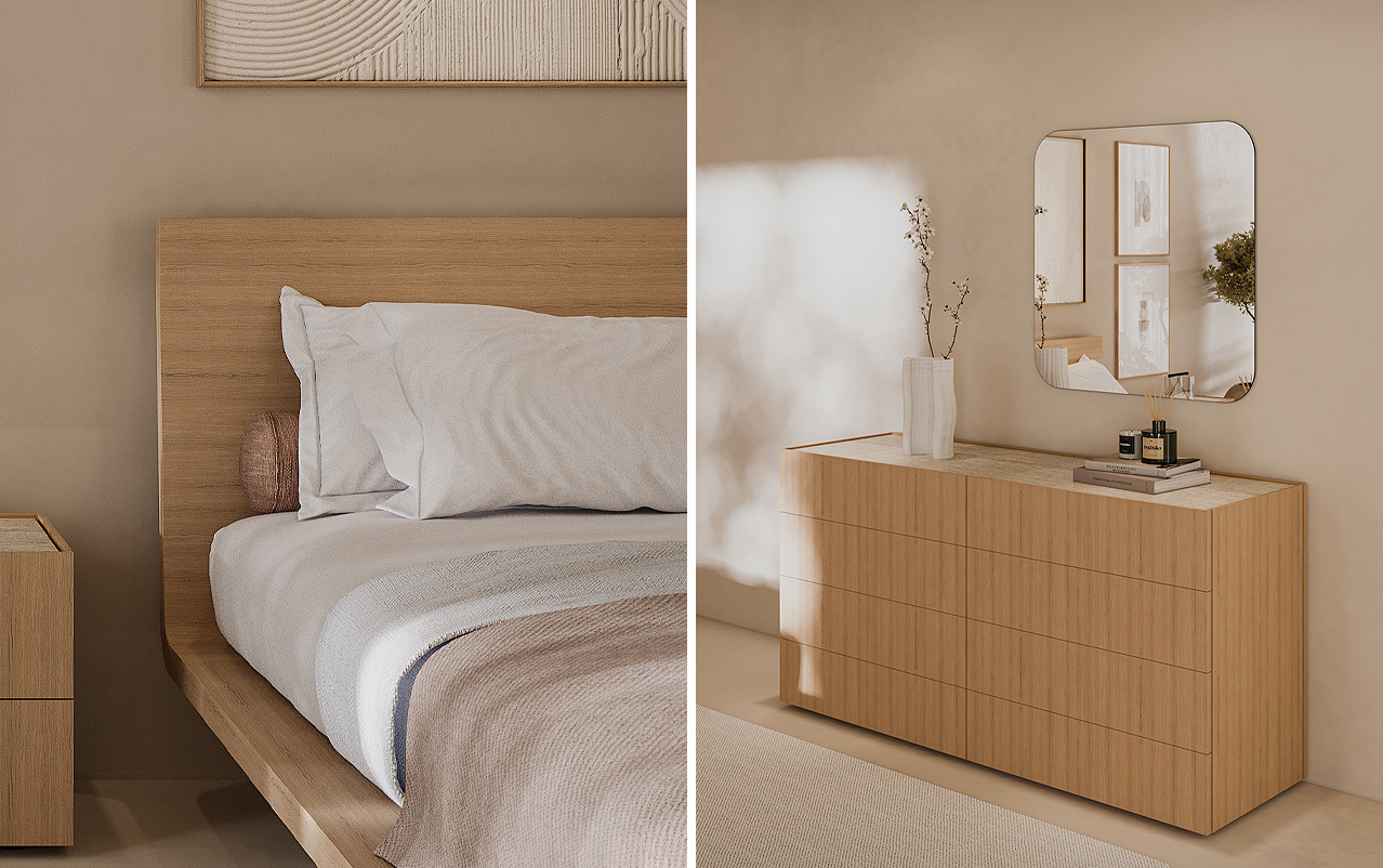 A partir daqui, tudo foi pensado para se integrar, sem nunca competir. A cama Ter é o elemento central — e não por acaso. O seu design é fluido e harmonioso, com uma estrutura que se funde com a cabeceira, formando uma peça contínua, orgânica, sem quebras visuais. É uma cama que se vê e se sente: sólida, mas leve; minimalista, mas envolvente.