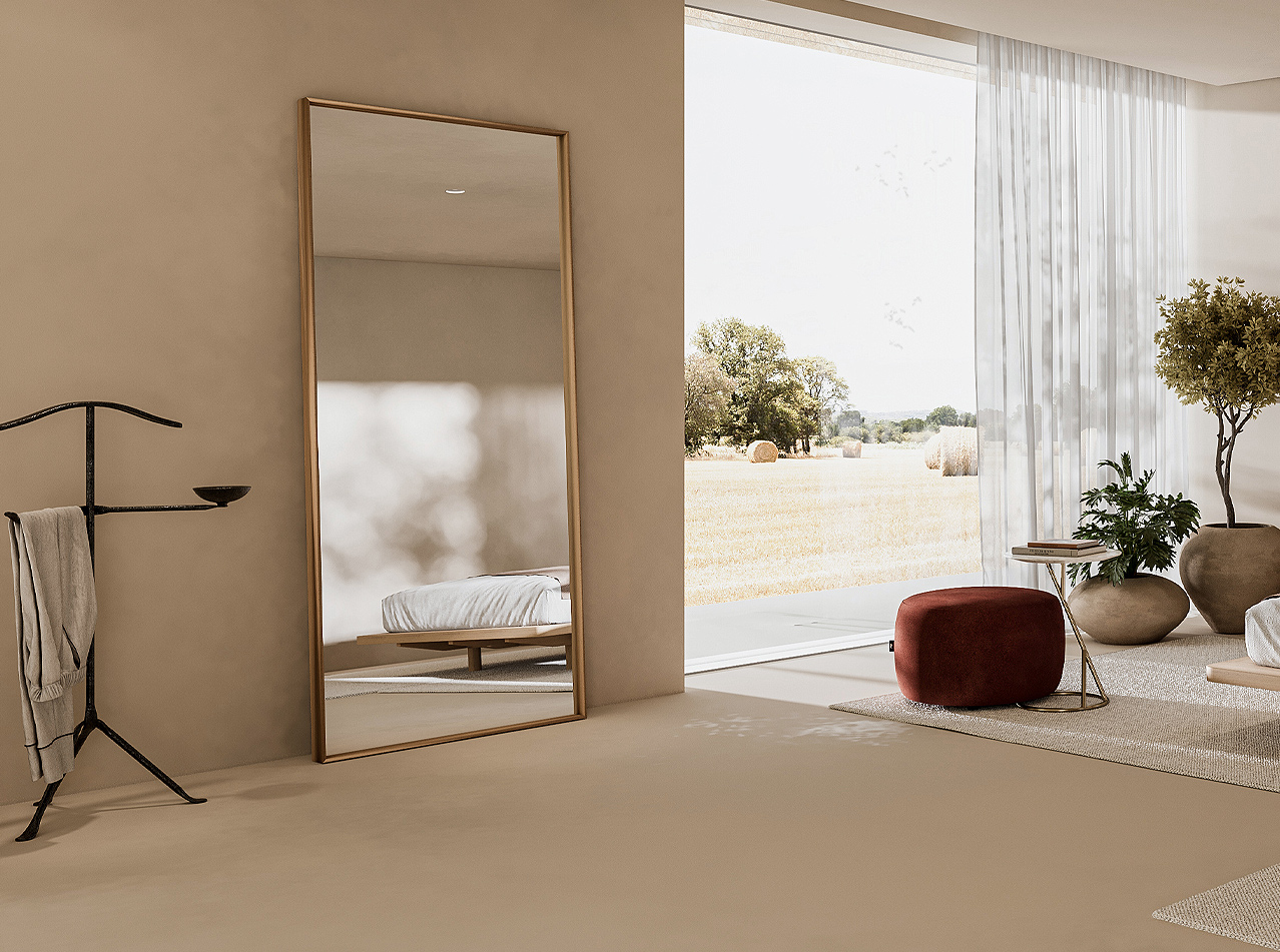 No plano vertical, o espelho Isaac cumpre duas funções: amplia visualmente o espaço e prolonga a paleta natural, graças à sua moldura em carvalho. A sua dimensão generosa ajuda a equilibrar a composição e reforça a sensação de leveza que procurámos desde o início.
