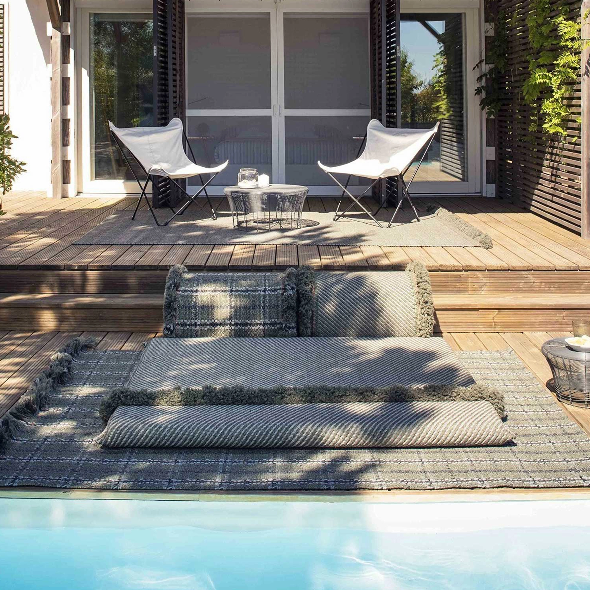 This large fringed mattress is the Diagonal model from the outdoor Garden Layers collection, which also includes rugs, rolls, cushions, beds, and side tables. Its fabric, with a diagonal weave of pearlescent and almond-colored threads, is made on manual looms with soft external fibers of special polypropylene, as pleasant to the touch as natural ones. Its filling is made of quick-drying rubber foam.