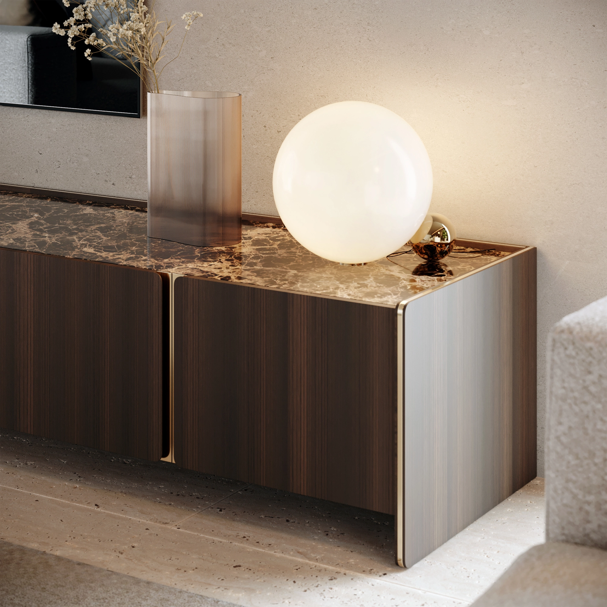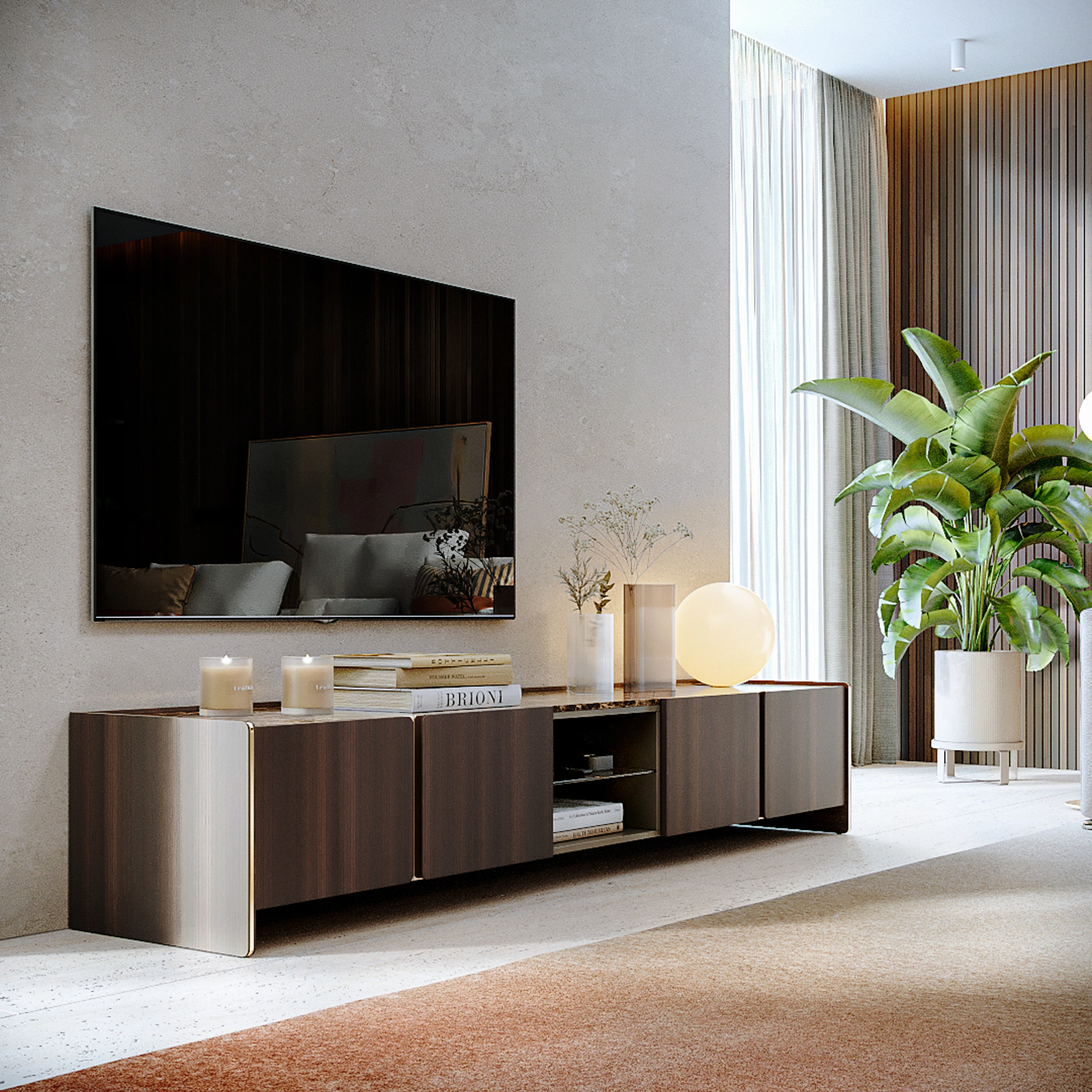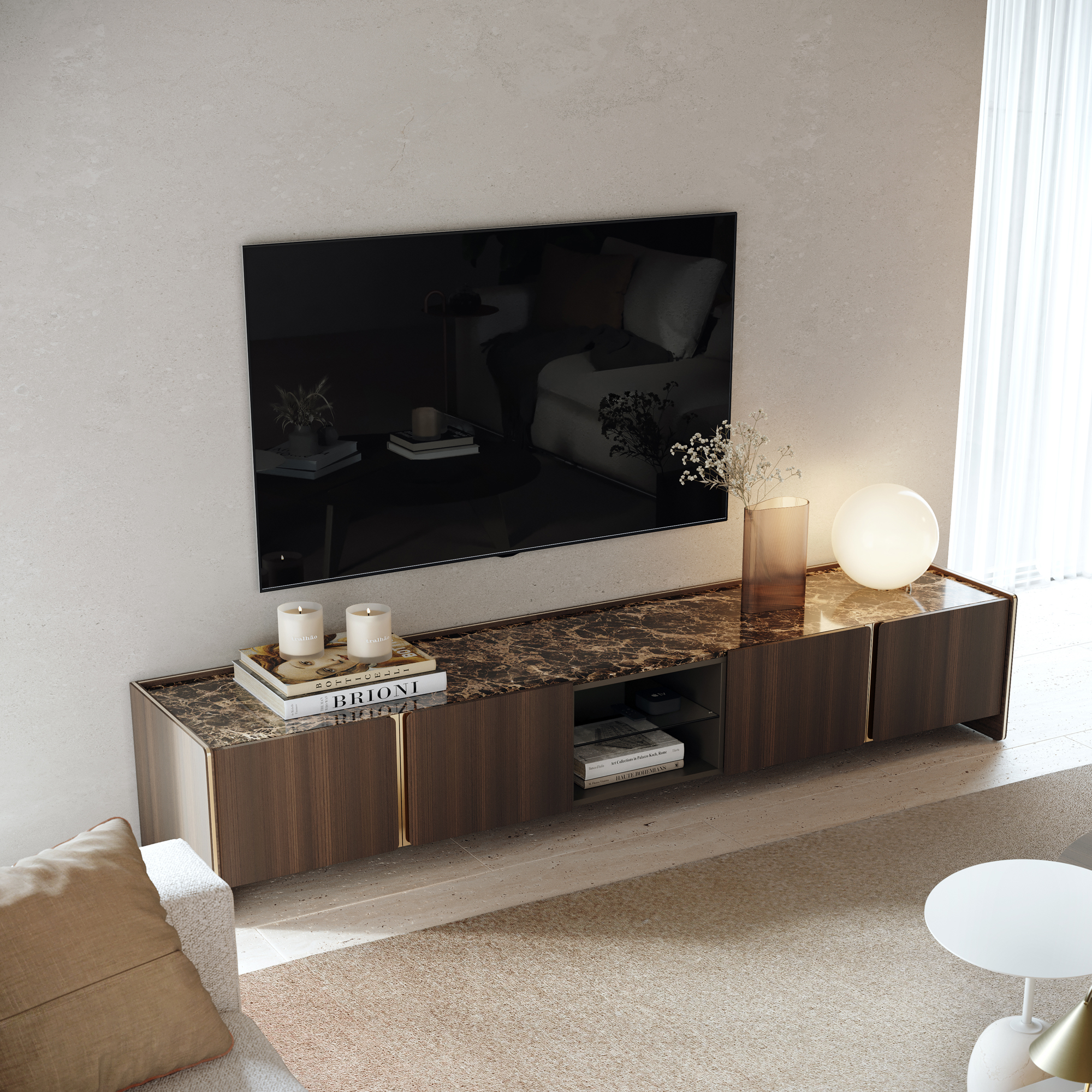 Com um design sofisticado e requintado, o móvel tv Ava é composto por quarto portas de batente e uma caixa central aberta, com entalhes em aço inox nas portas e estrutura exterior. O seu interior é dividido em cinco elementos, contando assim com quatro prateleiras amovíveis de madeira e uma prateleira amovível de vidro gris no módulo aberto. Além disso, conta também com pés deslizantes que facilitam a sua movimentação no espaço.
